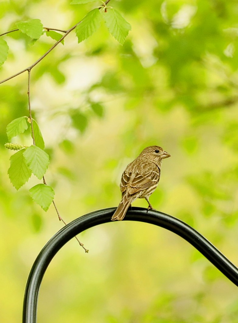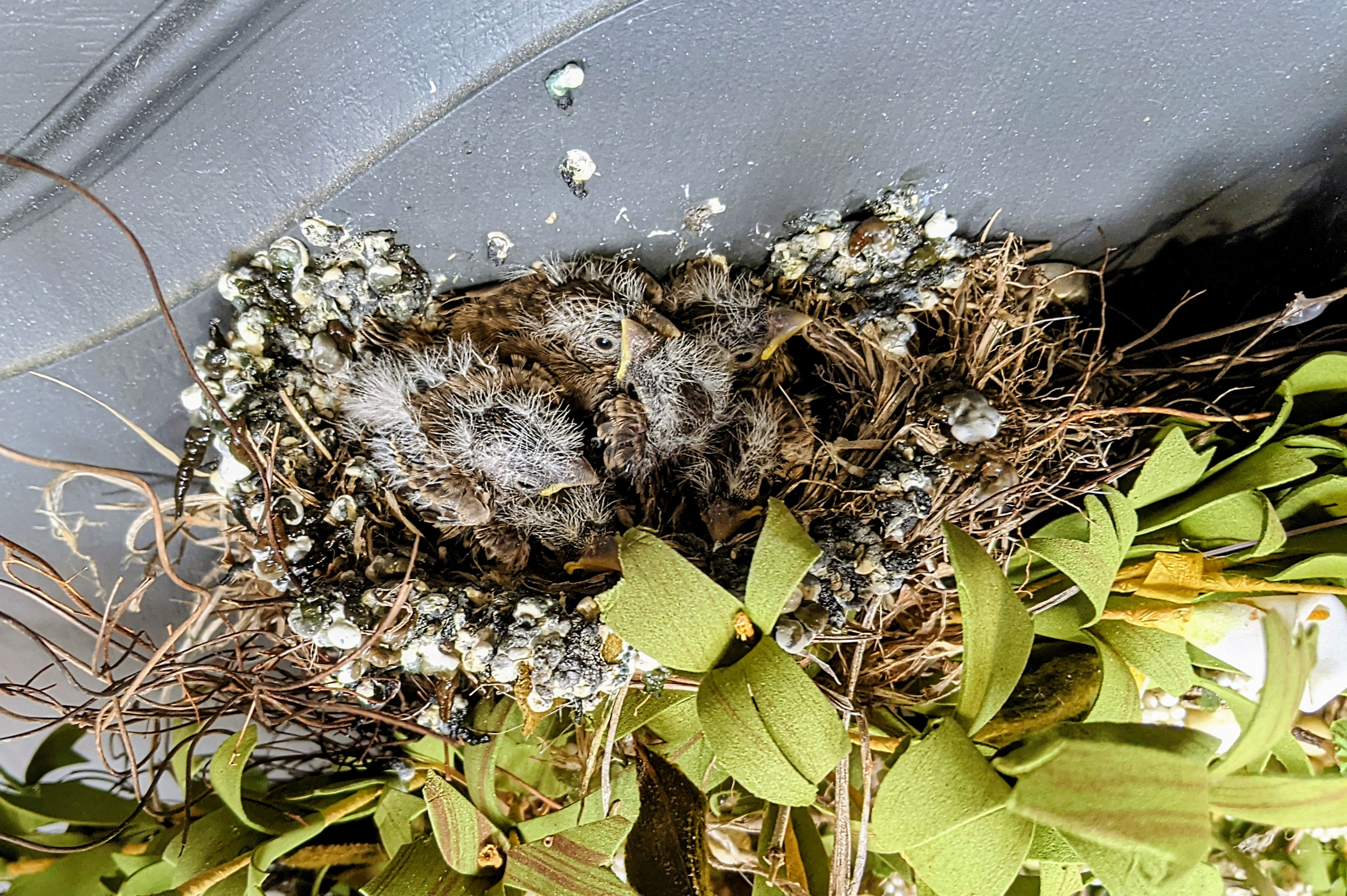Per usual, I’ve been snapping a few pics of the birds around the house. I was finally able to put the feeders up again about two weeks ago with no signs of sick birdies. I sure missed my little feathered friends! A pair of house finches made their nest on the wreath on the front door. Their brood of six have all made it so far, as you can see below. Mom and Dad have been keeping the nest floor clean by putting the little nippers’ poo on the edges of the nest. That will be fun to clean up 😝.