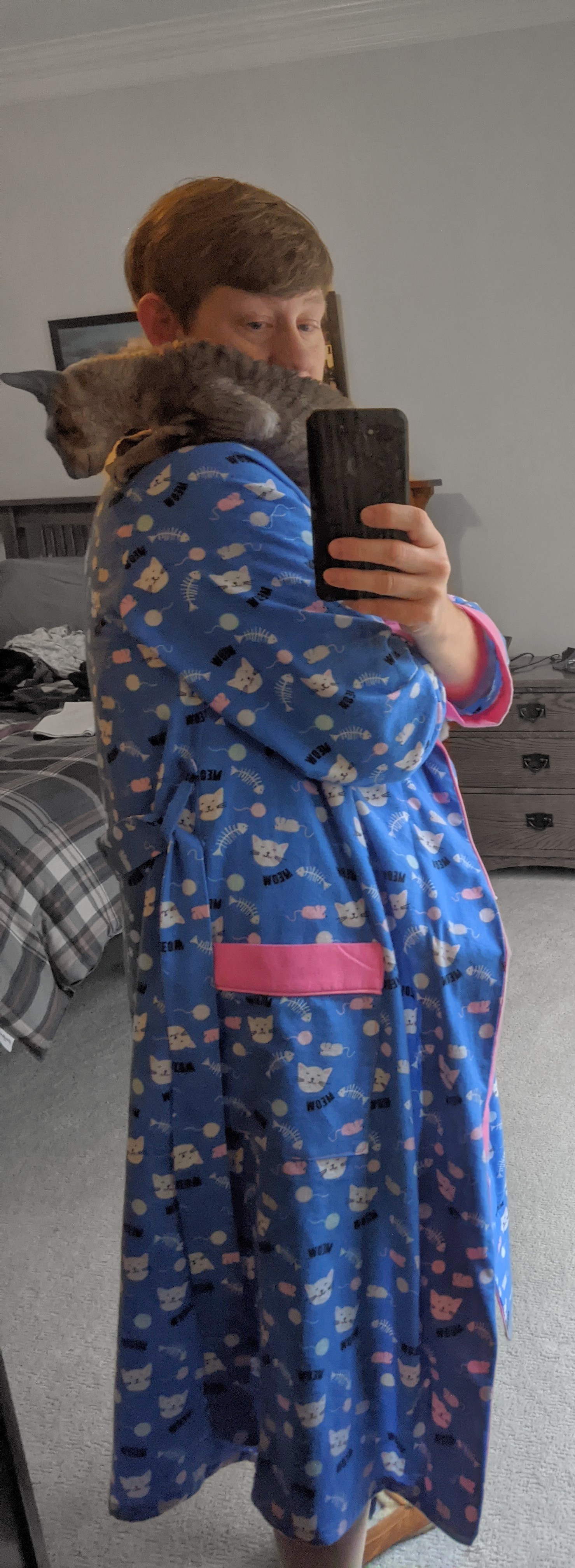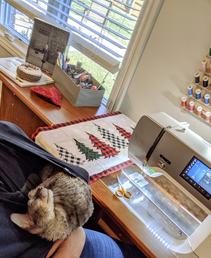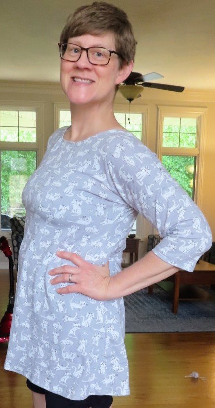 During the time it took to recover, I didn’t do much. I filled the lethargic days by hanging out with and generally loving around on the cats, reading an Inspector Morse mystery, listening to Dickens’ Bleak House, putting some puzzles together on my favorite puzzles app, and sleeping a lot. Finally, on Thursday and Friday, I ventured back out on the patio for short bits in the mornings and evenings – to avoid the heat, another no-no when you have MS – and even managed to muster the energy to sew a cute little tunic with an adorable cat print for myself!