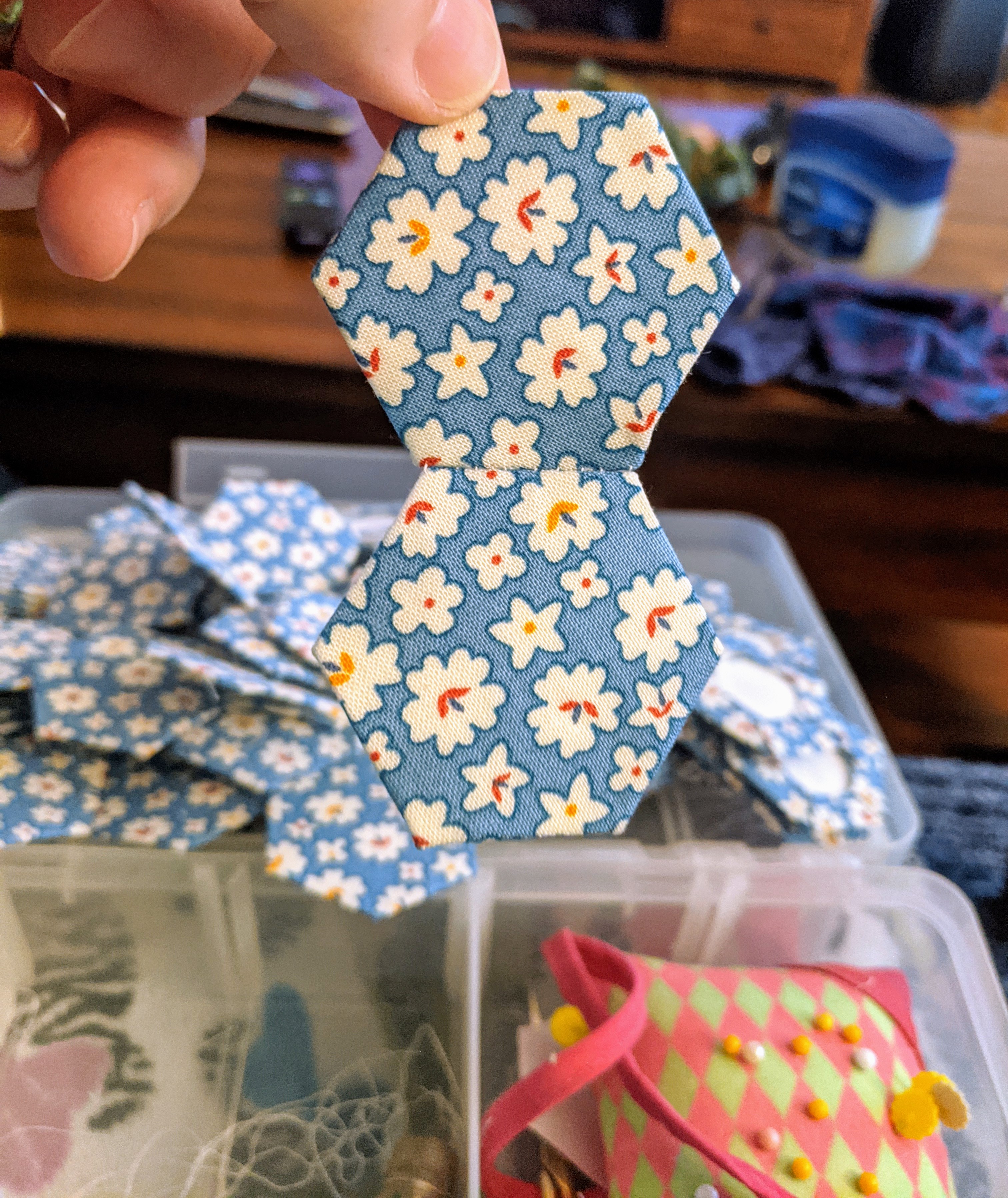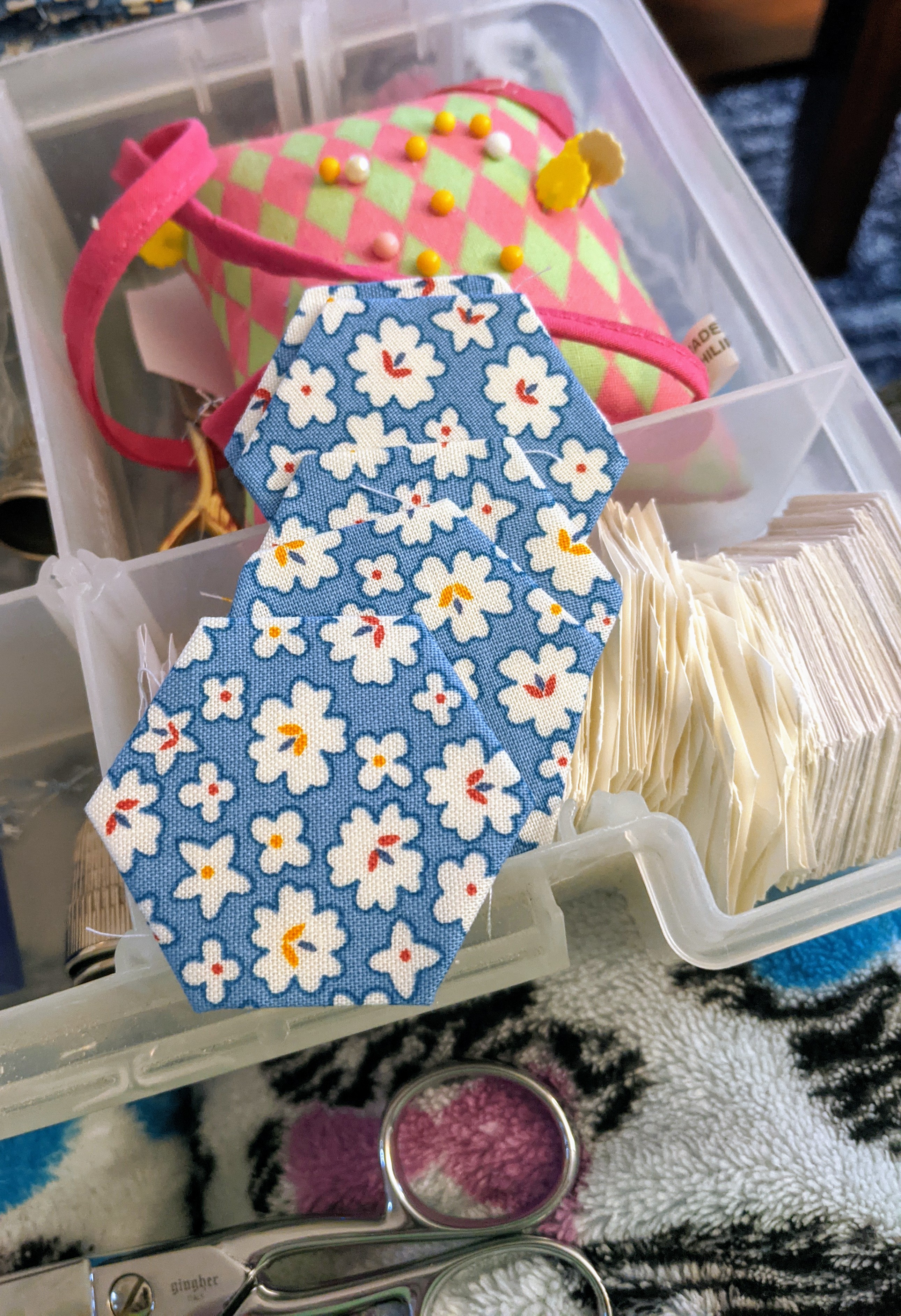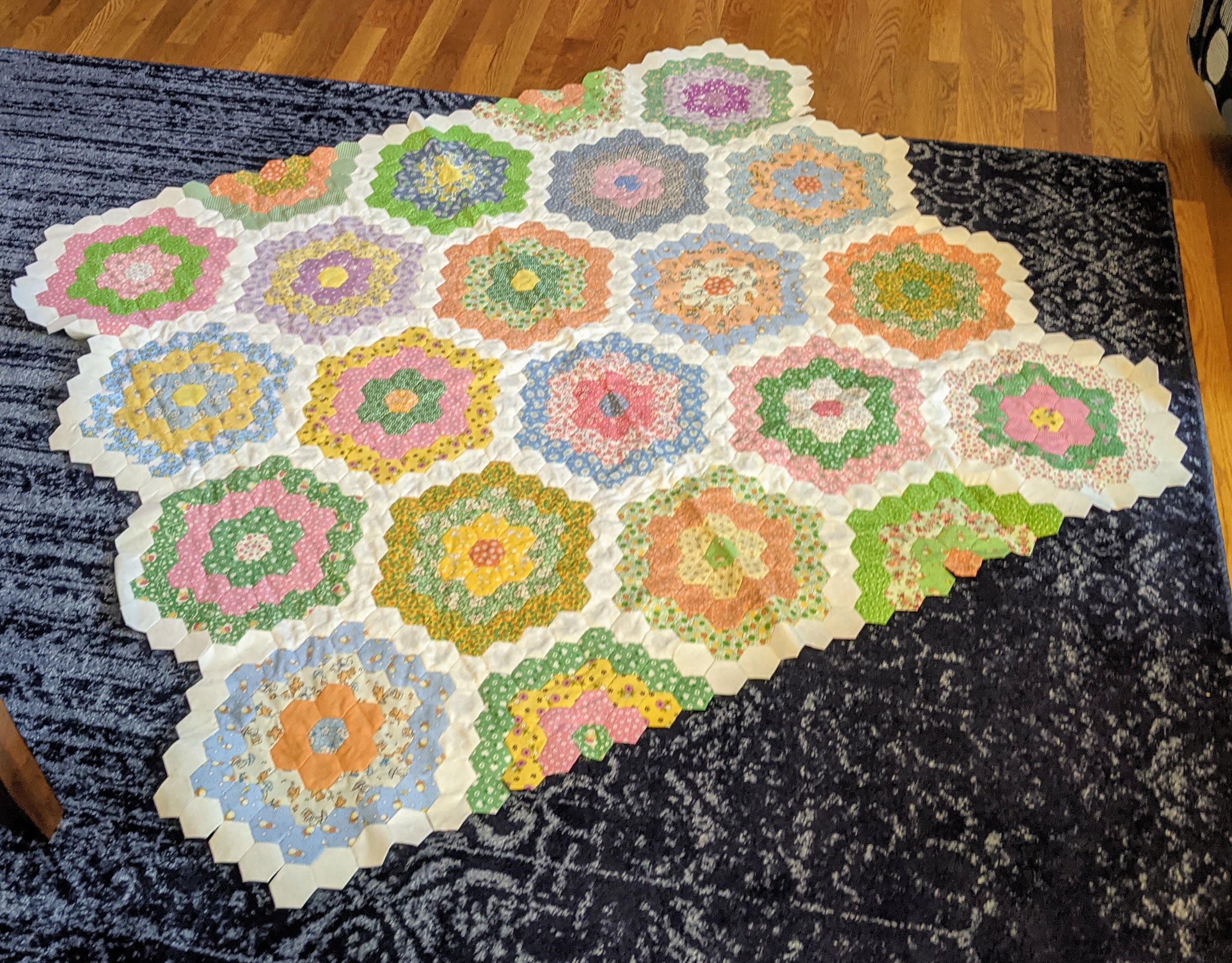 My stepmom who recently passed away was an avid quilter. She had nearly finished hand sewing this English Paper Piecing quilt but it still lacked it’s blue border. My stepsister asked me if I would add the border so it could be quilted. I’ve handsewn a couple of quilts in the past but nothing prepared me for the sore fingers, slow going, and incredible amount of time it has taken to sew the teeny-tiny speck of hems together that border the thick paper stuffed inside each hexagon. As you can see in the second picture, you take the paper out after a couple of rows have been sewn together, the paper is basted into each hexagon to stabilize the fabric as it’s put together. This wasn’t the first paper piecing quilt my stepmom did. For her, the harder the project the better the challenge and she had the chops for it! She must have poured hours into this project. It’s good to be contributing to something I know she would be happy to see finished.