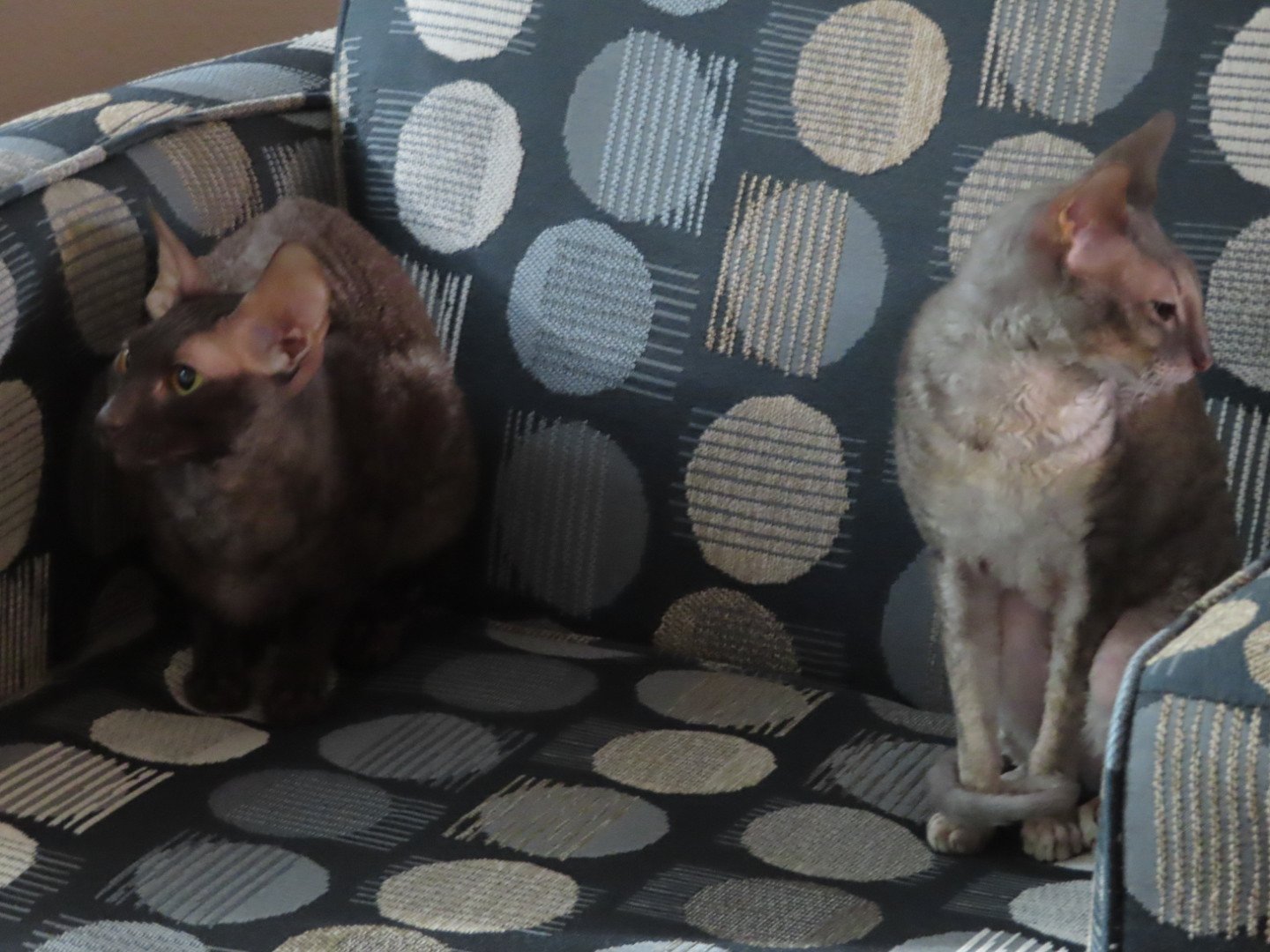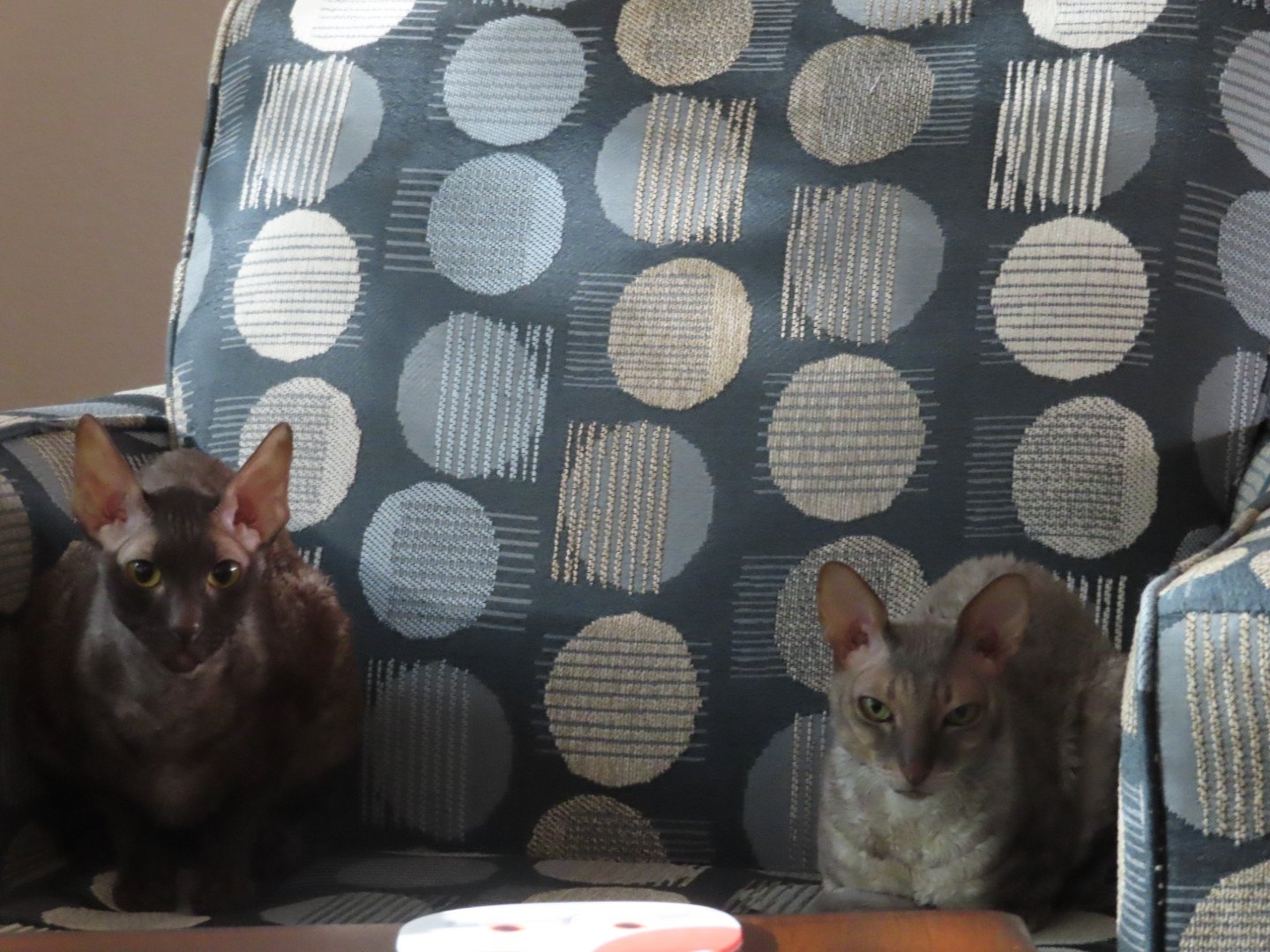 Our Cornish Rex cats, Laudy and Pip, made the transition to the new house swimmingly. They hung out in our master bath and closet during the move, then came out once everyone was gone to check the place out. Our new reclining love seat provided a much needed place to take a break. There was little rest for the weary though. We worked hard Sunday afternoon to clear paths and locations for our furniture.